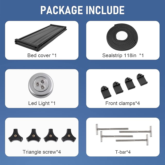 - Package includes:Bed cover *1,Sealstrip 118in *1,Front clamps*4,T-bar*4,Triangle screw*4,Light *1.