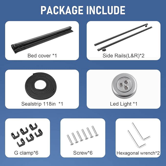 - Package includes:Bed cover *1,Side Rails(L&R)*2,Sealstrip 118in *1,G clamp*6 Light *1,Screw*6,Hexagonal wrench*2.