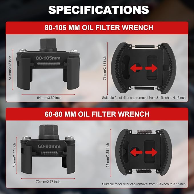 - Applicable Sizes: Small size clamping range is 60-80 mm (2.36-3.15 inches), and medium size clamping range is 80-105 mm (3.15-4.13 inches). Ideal for filter removal and compatible with various vehicle models