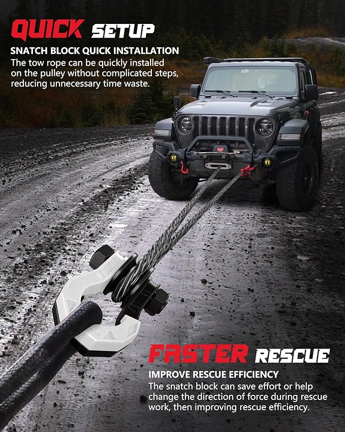 - Snatch Block Necessity: The winch pulley can double the result with half the effort in towing and recovery work, double the winch pulling power, distribute the force, and prevent the winch from overheating. Plus, As it allows you to change the direction of your off-road recovery when you need to navigate through trees or other obstacles