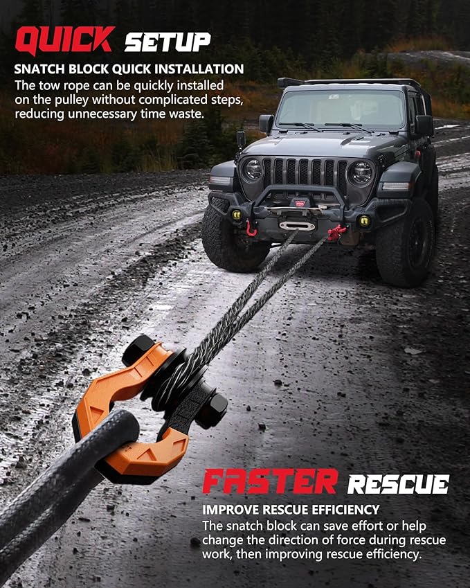 - Snatch Block Necessity: The winch pulley can double the result with half the effort in towing and recovery work, double the winch pulling power, distribute the force, and prevent the winch from overheating. Plus, As it allows you to change the direction of your off-road recovery when you need to navigate through trees or other obstacles