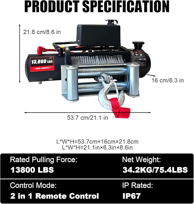 - Widely Applicable Scenarios: 13800Ibs pulling capacity helps you rescue vehicles from muddy, sloped and rugged ground. Suitable for ORV and UTV, waterproof, mud-proof, snow-proof, weather-resistant, wide range of applications. 12V Electric Winch is your right-hand man for a variety of challenges with its comprehensive enhanced design, powerful motor power, wireless control, and pulling capacity suitable for various scenarios.