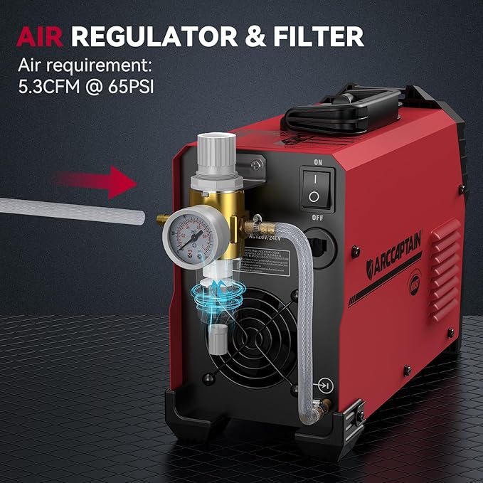 - 【Easy to Set Up】 There is an air pressure sensor inside the machine, allowing users to adjust the air pressure using the regulator. The air filter is mounted at the rear of the machine, enabling quick connection, saving installation time, and improving efficiency. The recommended air compressor pressure value is within the range of 60PSI, 5.3CFM. PLEASE NOTE: The Torch is AG60 Plasma Torch. NOTE: Requires compressed air (compressor sold separately).