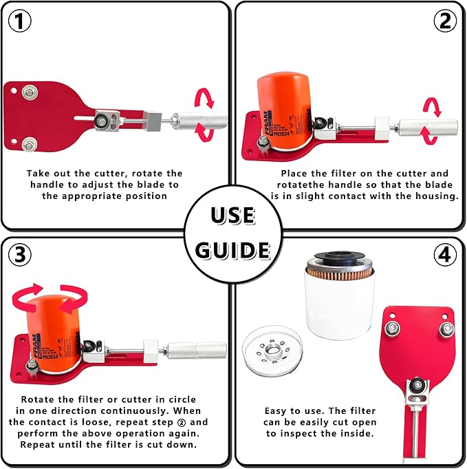 - Aluminum Oil Filter Cutter: The cutter is made of red anodized aluminum alloy, which is strong, durable, and rust and corrosion resistant. Aluminum alloy material is also convenient for DIY modification. The cutter tool is composed of an aluminum alloy billet platform, 2 positioning rollers, a blade and a feed screw with non-slip handle. Well built oil filter cutting tool