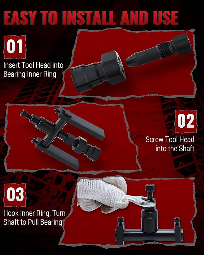 - Built to Last: Our motorcycle bearing puller is made of premium alloy steel for long-lasting service. The bearing remover set features heat-treated and blackened threaded rods that offer excellent hardness, toughness, and durability