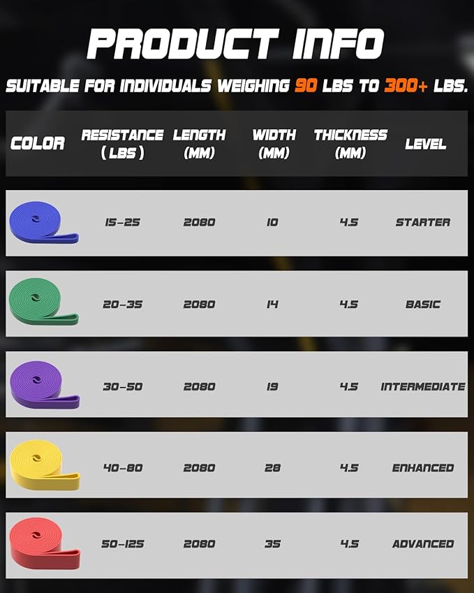 - 5 Resistance Levels: Our Pull Up Resistance Band Set includes 5 bands color-coded for different resistance levels: Blue (15-25 lbs), Green (20-35 lbs), Purple (30-50 lbs), Yellow (40-80 lbs), and Red (50-125 lbs).