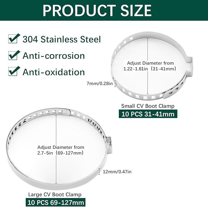 - PRODUCT SIZE:The CV boot clamp tool boast adjustable jaw openings, reaching a maximum of 0.71 inches.And included 2 models of single ear clamps, small size (1.2-1.6in) 10PCS, large size (2.7-5in) 10PCS, can meet most of the needs