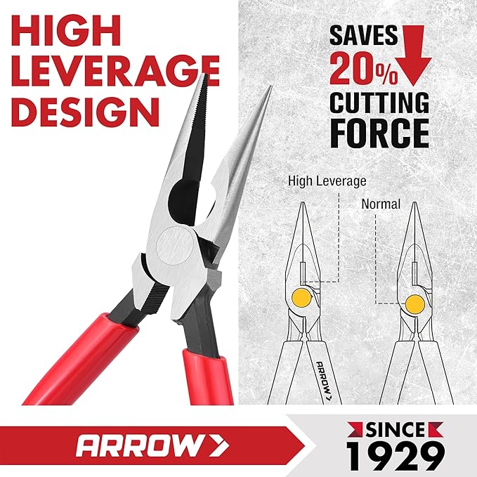 ARROW 6" High Leverage Needle Nose Pliers with Side Cutters, Long Nose Pliers for Gripping, Wire Bending, Cutting