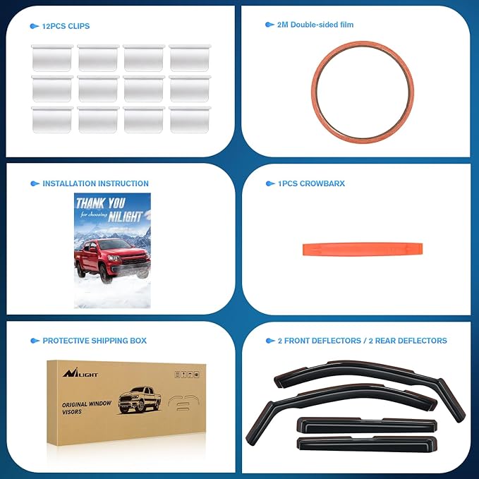 - PACKAGE INCLUDED:4 PCS Rain Guards,12pcs clips,Crowbar 1pcs,78inch double-sided tape and installation instruction