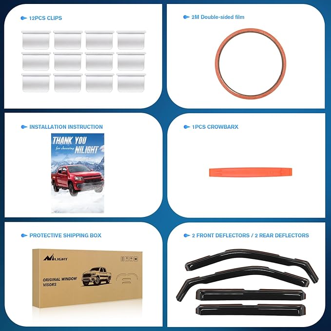 - PACKAGE INCLUDED:4 PCS Rain Guards,12pcs clips,Crowbar 1pcs,78inch double-sided tape and installation instruction