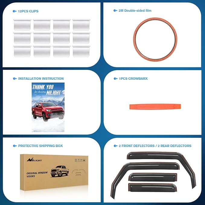 - PACKAGE INCLUDED:4 PCS Rain Guards,12pcs clips,Crowbar 1pcs,78inch double-sided tape and installation instruction