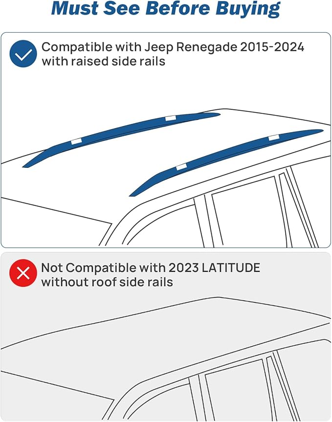 - 【Compatible Vehicle】: Patent-protected design. Compatible with Jeep Renegade 2015-2024, including Latitude, Sport, Limited, Trailhawk and RED. Specially adapted for your vehicle. (NOTE: Not fit for 2023 LATITUDE without roof side rails).