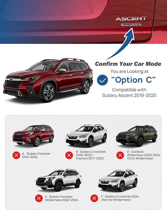 - Attention Before You Buy: You are choosing Option "C" cross bars compatible with Subaru Ascent 2019-2025 (with factory-raised side rails). If you are not sure, please get in touch with us for confirmation