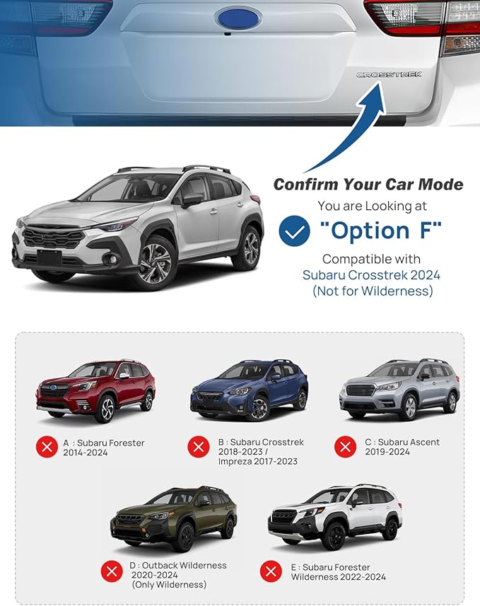 - Attention Before You Buy: You are choosing the Option "F" cross bars only compatible with Subaru Crosstrek 2024 (with factory-raised side rails), not fitting Wilderness model. If you are not sure, please get in touch with us for confirmation