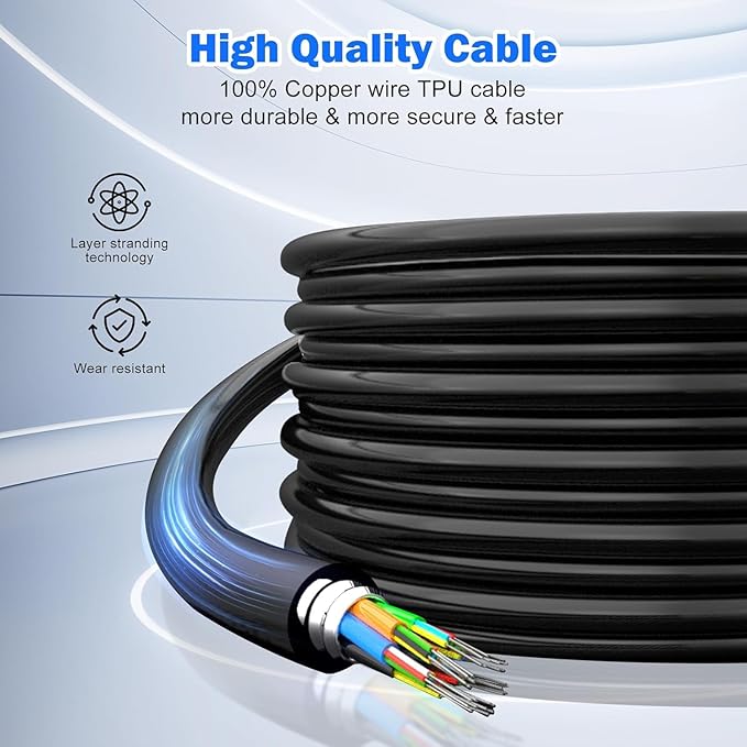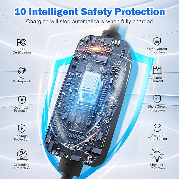 - 【More Focus on Safety】 We added more hard materials to the shell to make the overall hardness higher. It will not break even if a family car runs over it. FCC certification ensures product quality and safety of use. Our charger equipped with intelligent chipset that provides overcharging, overvoltage, overheat, overcurrent, short circuit and leakage protection. IP67 waterproof protect internal circuits. The gaps are small and it is difficult for water to enter. The working temperature ranges from -22°F to 122°F. Come with a locking designed to ensure that it cannot be easily pulled out in a locked state. 12000+ plug and unplug tests. 100% copper wire tpu cable.