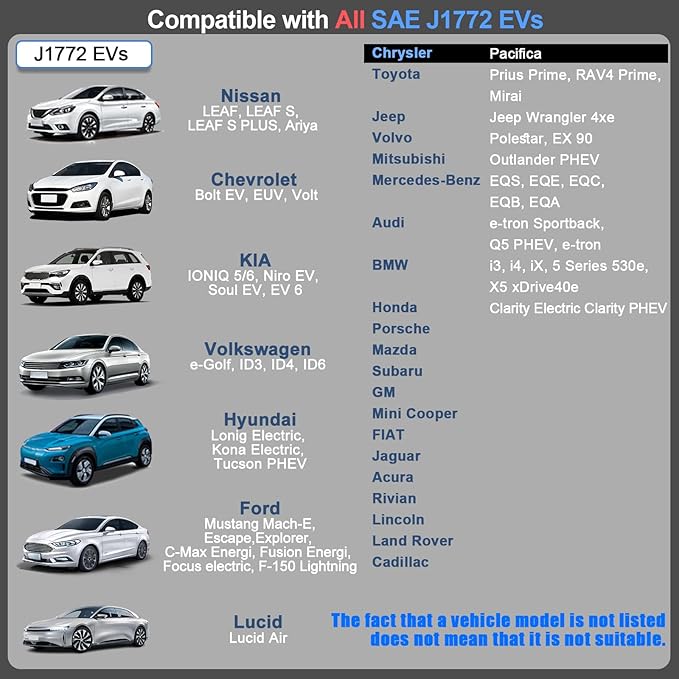 - 【Charger for All J1772 EVs】This portable ev charger is perfectly compatible with all J1772 electric vehicles and plug-in hybrids in North America, including Chevrolet Volt, Bolt EV, Nissan Leaf, VW, KIA, BMW, Ford, Honda, Hyundai and other brands.(But Tesla requires an additional tesla charger adapter). Plug and Play. Click the power button to change the option. Press and hold the power button to confirm that option is selected.
