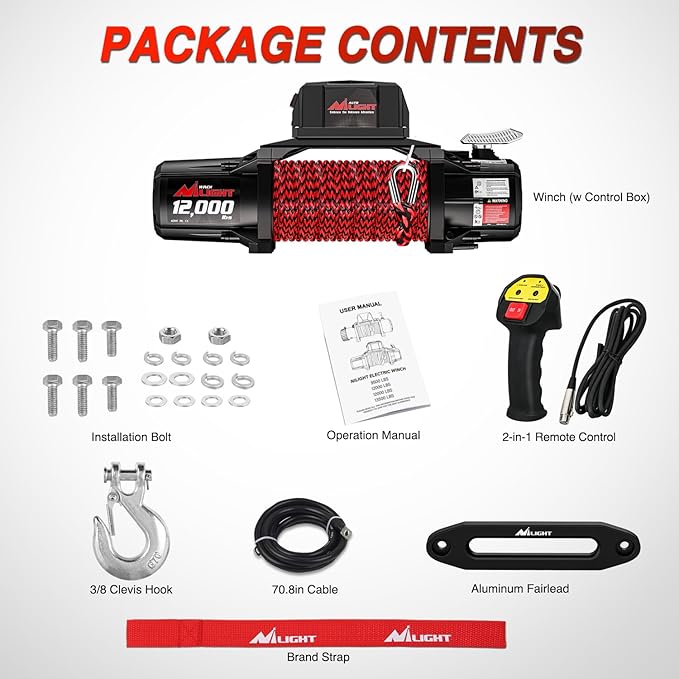 - POWERFUL TOWING: The new electric winch is powered by a 4.8kw/6.5hp output permanent magnet DC 12V motor with 12,000 lbs/ 5454 kg load capacity and comes with 9mm x 24m/ 3/8"x 79ft winch synthetic rope. The winches effortlessly handle off-road rescues and is widely applicable to atv, utv, automobile, boat, truck, jeep, SUV, modified vehicles, multi purpose utility trailers and more
