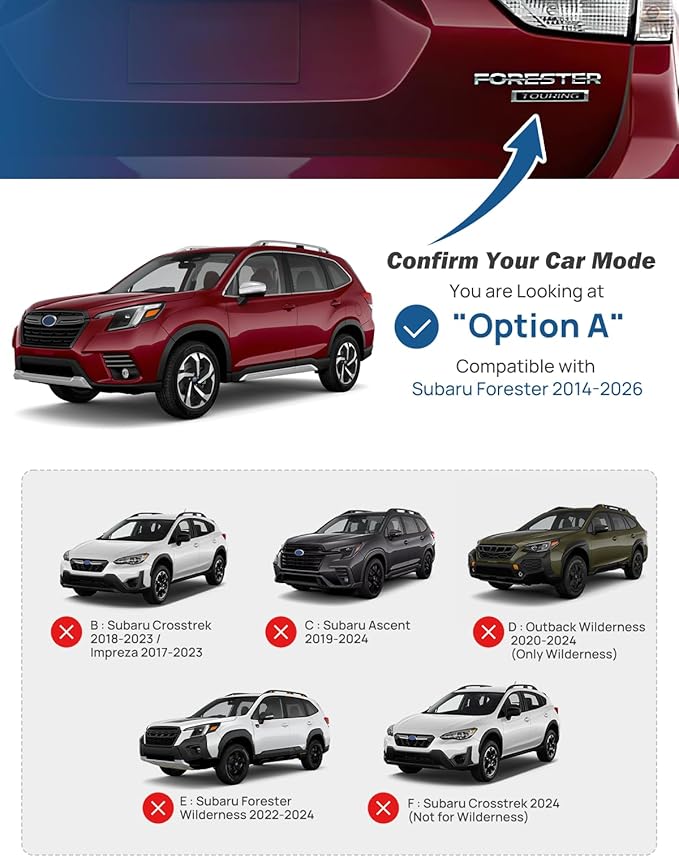 - Attention Before You Buy: You are choosing Option "A" cross bars compatible with Subaru Forester 2014-2026 (not for Wilderness,Subaru Sport 2025-2026, Subaru Touring 2025-2026). If you are not sure, please get in touch with us for confirmation