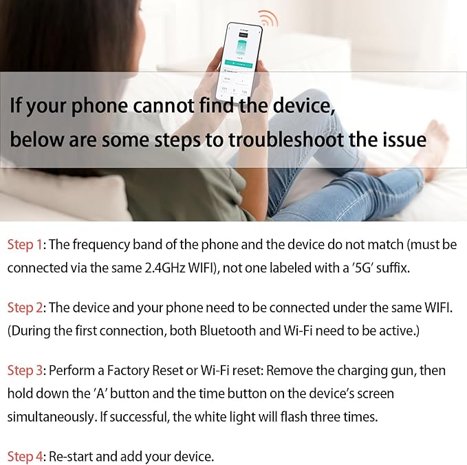 - Troubleshooting Charging Issues? -Check for foreign objects in the charging connector, cable damage, or loose contact between the connector and charging port. -Verify if the EV charger is powered on. If yes, restore factory settings by pressing and holding the "Current" and "Time" buttons until the white LED flashes three times, then restart the device. -Ensure the correct charging mode is selected: Plug & Charge, App Start, or Delayed Charging. -Inspect the vehicle’s locking mechanism to confirm the connector is securely locked. If not, unplug and reconnect to ensure proper locking