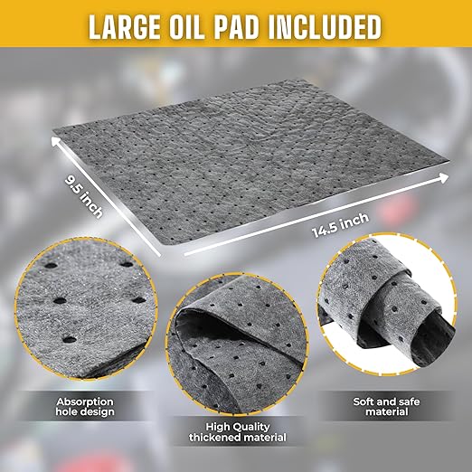 - Oil absorbent pad to prevent spilling on floors and other surfaces. Oil Funnel - Great for adding oil, or using when draining oil
