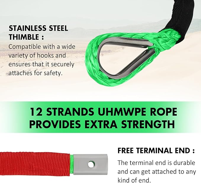 - 2.UHMWPE rope is an extremely high-strength, low-stretch rope that offers high abrasion resistance and great tensile strength.Our winch line won't store any kinetic energy under load and won't recoil in the event of breakage. It is a reliable muscle to help you get out of trouble during outdoor mishaps