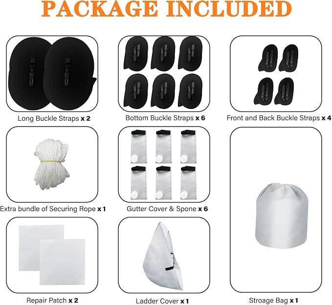 - Package Included- body windproof fixed buckle straps x2,extra bundle of white securing rope x1,repair patch x2,bottom windproof fixed buckle straps x 6,gutter cover & sponge x 4,ladder cover x1,front and back windproof fixed buckle straps x4,storage bag x1
