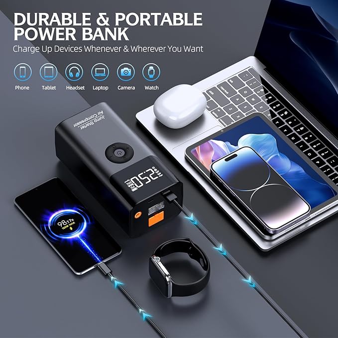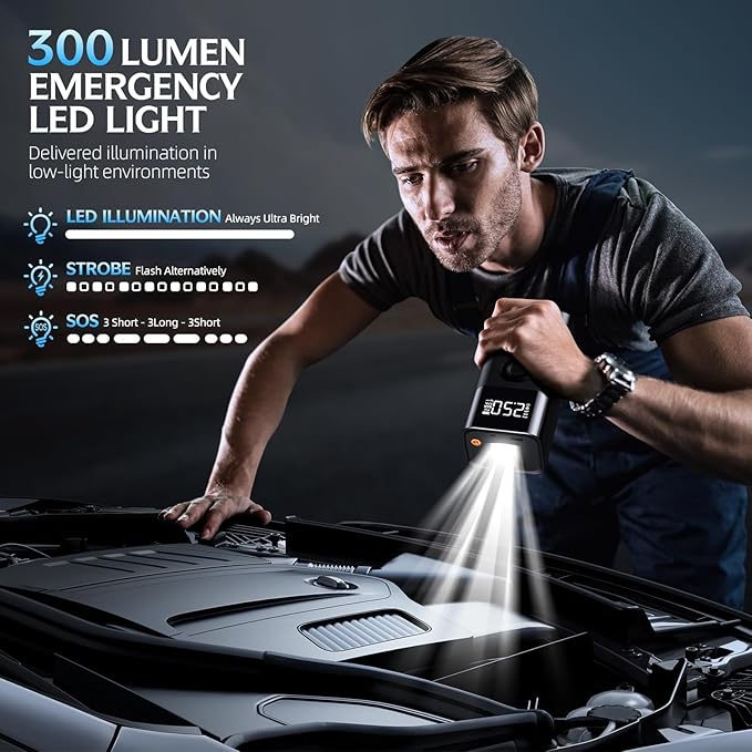 - POWERFUL JUMP STARTER - Portable Jump Starter with Air Compressor combines 4-IN-1 functions: car emergency start, tire inflation, power bank, and flashlight. It could provide up to 3500A peak current and high capacity, suitable for 12V cars (specially for up to 9.0L gas / 8.0L diesel engines). Supports more than 1000+ recharge cycles and can instantly start the car even in the extreme temperature range of -4℉ to 140℉, ensuring safety and reliability