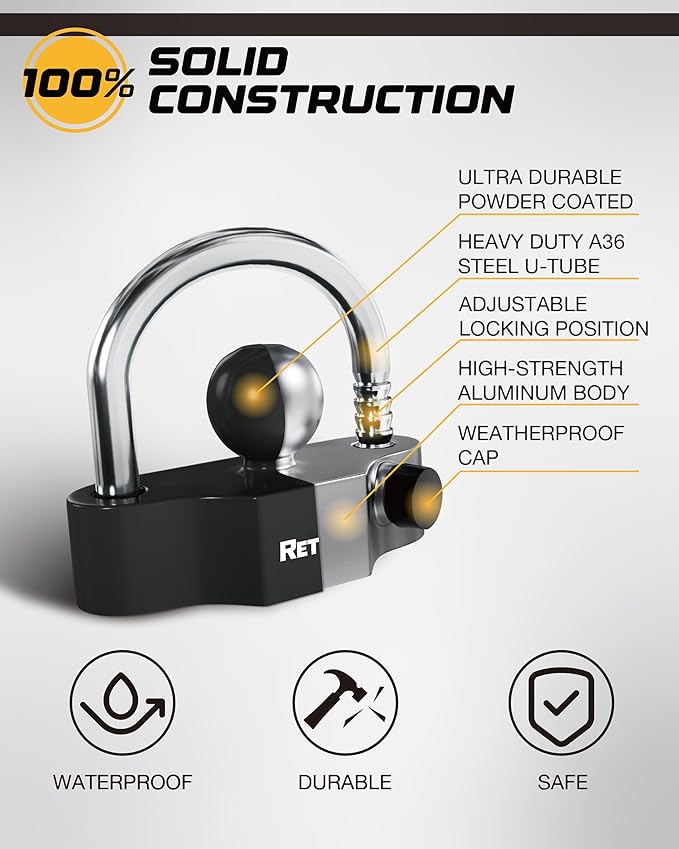 - SUPERIOR SECURITY: Crafted from an aluminum body and high-strength A36 steel, this trailer hitch lock offers robust resistance to cutting and shearing. It is rustproof, weatherproof, and has QC product quality certification