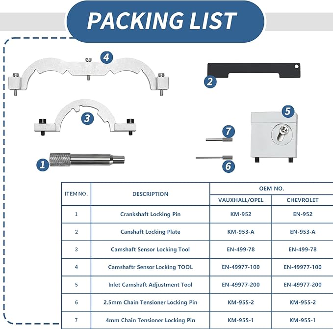 - [Comprehensive 7-Piece Kit] This Engine Timing Kit includes essential components such as a crankshaft locking pin, camshaft sprocket holding tool, camshaft setting plate, and chain tensioner locking pins. With all necessary tools for engine timing adjustments, this kit supports precise alignment and maintenance of your engine's timing system.