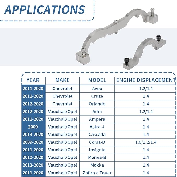 - [Precise Engine Timing] Turbo Engine Timing Tool Kit is designed to fit a variety of engines, including 1.2L / 1.4L Aveo, Cruze, and Orlando, as well as 1.0L, 1.2L, and 1.4L Vauxhall and Opel engines. This tool helps ensure accurate timing adjustments, supporting improved engine performance, fuel efficiency, and the prevention of potential issues.