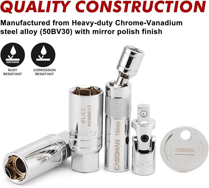 CASOMAN 10PCS 3/8"Drive Magnetic Spark Plug Socket Set, 6PT&12PT, Include Extension Bar, Universal Joint & Spark Plug Gapper, CR-V Steel