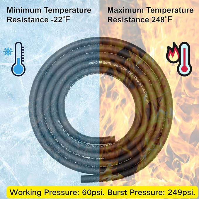 - Material: The fuel line is made of NBR rubber with braided nylon reinforcement embedded. It is suitable for leaded and unleaded gasoline, oil, diesel fuel, gasoline blends containing ethanol (E-10), E85, biodiesel, and sour gas. The SAE 30R7 fuel line is ideally suited for automotive low-pressure applications, including carburetors, fuel return lines, PCV connections, and emissions devices.