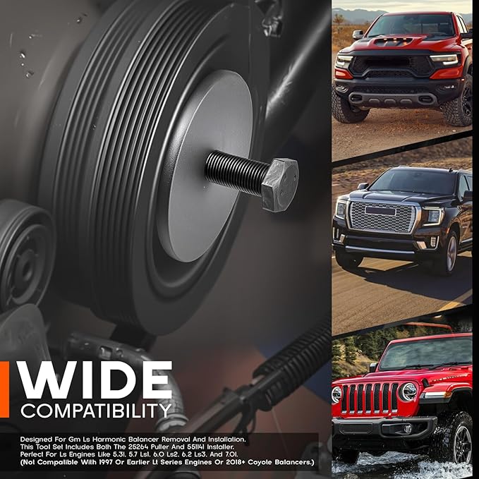 - WIDE APPLICATION: This harmonic damper puller is designed to work for GM with 5.3L, 5.7L LS1, 6.0L LS2, 6.2L LS3, and 7.0L engines. It's also compatible with CHRYSLER, JEEP, and DODGE models featuring 3.5L V6, 3.6L V6, 4.7L V8, 5.7L V8, and 6.1L V8 engines, making it a versatile tool for multiple car brands.