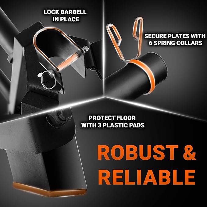 - STABLE & SECURE DESIGN: Olympic weight plate holder features a triangular support structure, rubberized bar storage, plastic pads for stability and floor protection; Barbell storage includes collars to secure weights and a security pin for the barbell