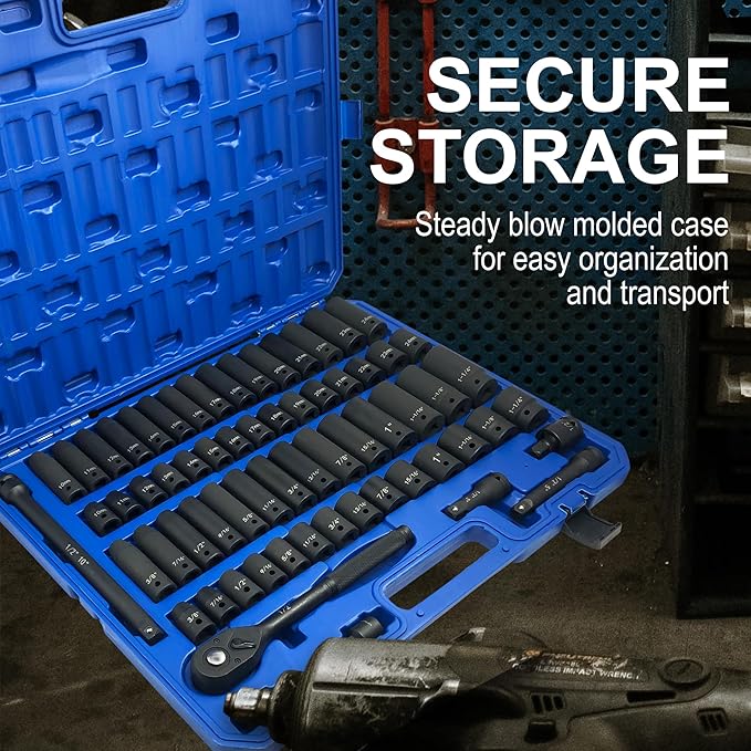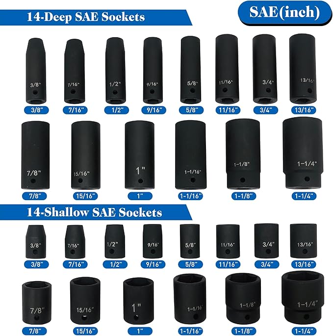 - Comprehensive Set: This 65-piece 1/2-inch drive impact socket set contains SAE sizes from 3/8" to 1-1/4" and metric sizes from 10mm to 24mm, including both deep and shallow sockets.
