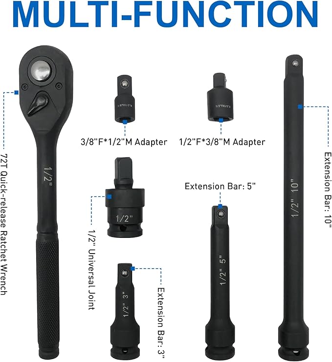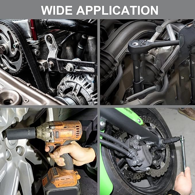 - Versatile Accessories: The set includes adapters, extension bars, and a ratchet handle for added convenience and versatility.