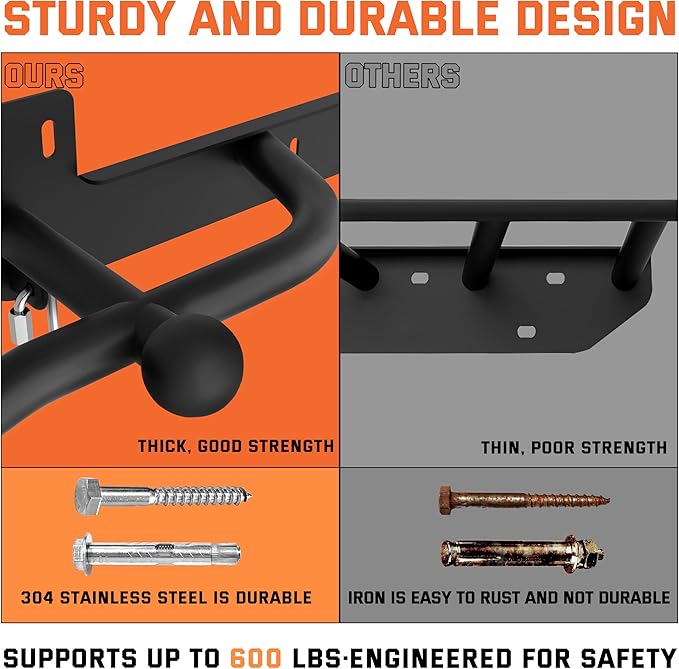 - HEAVY DUTY AND STABLE:This heavy duty pull up bar is fully welded,Made of durable steel tubing,reinforced with 2 steel plates below , our rogue pull up bar can support up to 600 lbs and withstand years of use. The 6-hole design ensures more stability and safety than other wall mounted bars