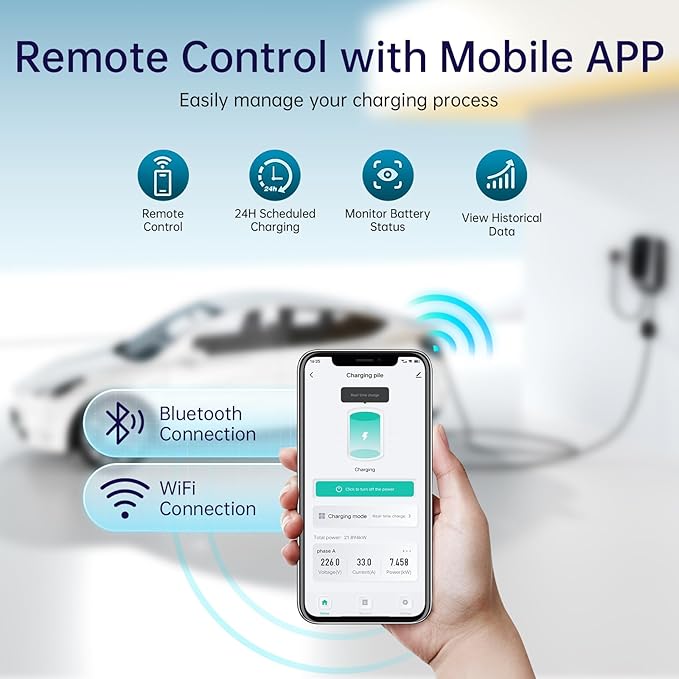 - 【Smart APP Control & 24-hour scheduled charging】Equipped with a 4.3-inch display, you can monitor the charging status clearly. After setting up your charging station via 2.4GHz WiFi and Bluetooth, you can also remotely control, monitor the charging status, adjust the charging current and view the charging history through the APP. The scheduled charging function (1-24 hours) can help you effectively avoid peak charging periods, reduce charging costs and optimize charging efficiency.