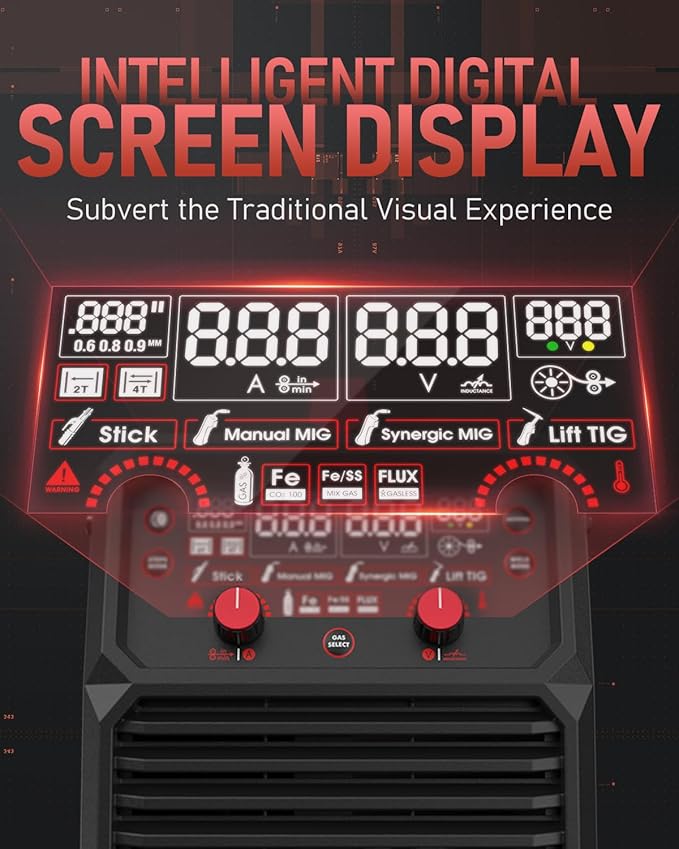 - 4 IN 1 MULTIFUNCTIONAL: Enjoy the convenience of a 4-in-1 welding machine that masterfully handles Gasless Flux Core MIG/Gas MIG/Stick/Lift TIG (additional lift TIG torch required). This unit suits a wide range of welding applications and meets your various welding needs.