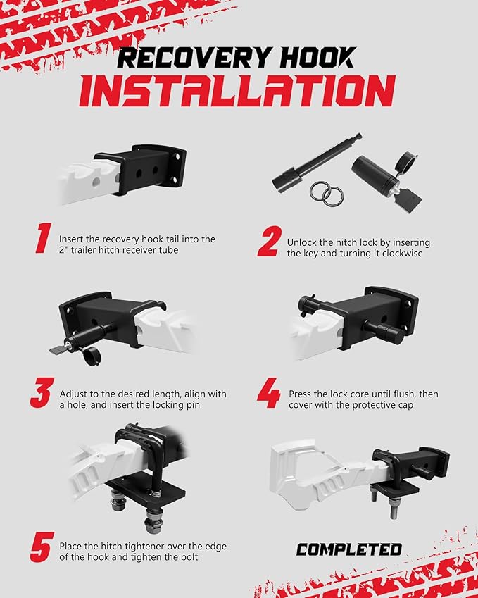 - APPLICATION: This tow hook is not only suitable for truck hitch but also for hardline off-road vehicles, trailers, SUVs, ATVs, UTVs, and other vehicles with a 2-inch receiver tube. We have provided an extended trailer lock to fit more vehicles. Please confirm that the lock length is suitable for yours