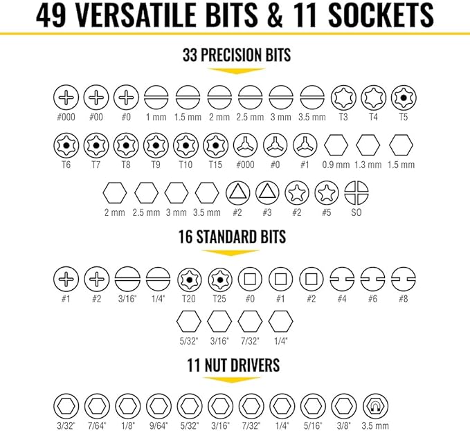 - VERSATILE PRECISION SET: Precision Ratchet and Driver System includes a micro-ratchet and adjustable screwdriver, 33 precision bits, 16 standard bits, 11 nut drivers, and a precision bit holder for diverse jobs