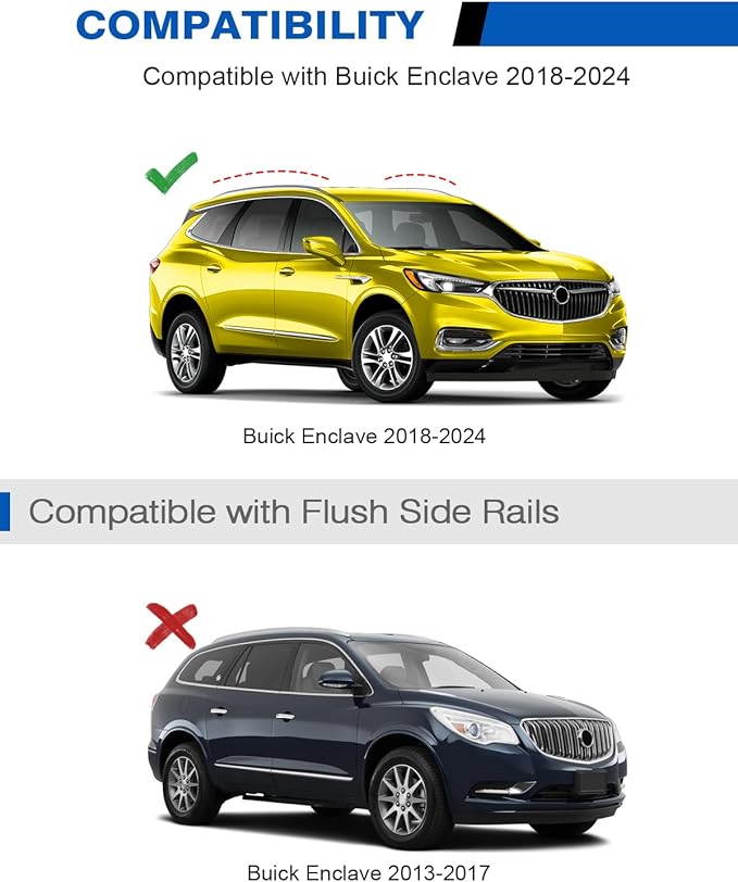 - 【Compatibility】Compatible with Buick Enclave 2018 2019 2020 2021 2022 2023 2024 2025 WITH Side Rails. It will affect the opening of the front sunroof. Please check your vehicle's Year, Make and Model before purchase.