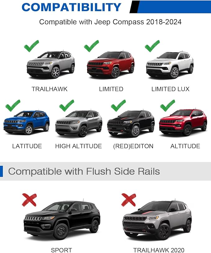- 【Compatibility】Compatible with Jeep Compass 2018 2019 2020 2021 2022 2023 2024 2025 with factory side rails.Note:Not Compatible with Jeep Compass sport & Trailhawk 2020. Please check your vehicle's Year, Make and Model before purchase.