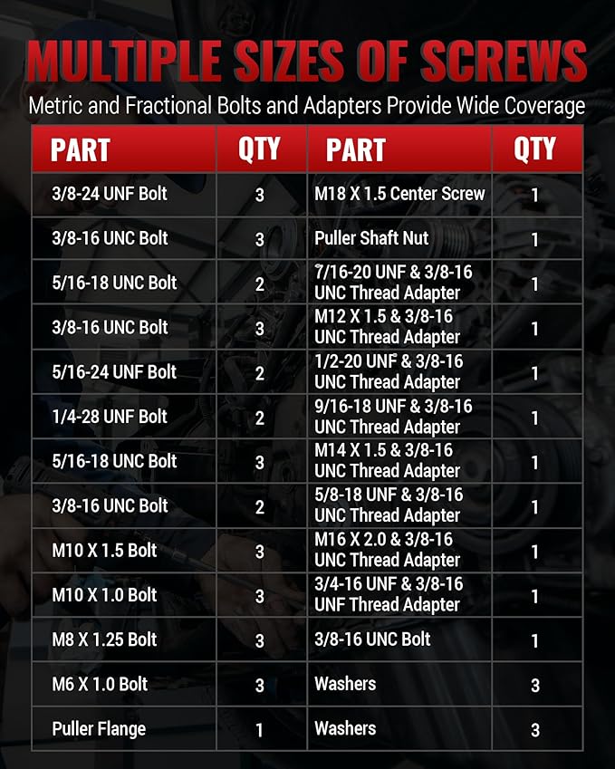 - Product Specifications: This harmonic balancer puller kit includes bolts with threads: 3/8-24 UNF, 3/8-16 UNC, 5/16-18 UNC, 5/16-24 UNF, 1/4-28 UNF, M10x1.5, M10x1.0, M8x1.25, and M6x1.0 for versatile compatibility