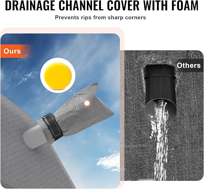 - Complete Accessories: The camper cover kit includes 6 sponge drainage covers, 1 storage bag, 1 repair patch, and 1 roll of double-sided tape. The sponge covers prevent snagging on sharp metal edges. If the cover gets cut by branches or sharp edges, simply apply the repair patch with our double-sided tape. The cover can be easily folded and stored in the bag when not in use. Our RV cover also features "FRONT" and "END" labels for easy identification.