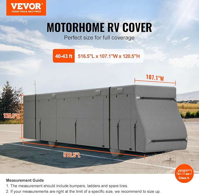 - Fit 40-43 ft RVs: This class A RV cover measures 516.5"L x 107.1"W x 120.5"H, providing a perfect fit for 40'-43' Class-A RVs. The set also includes 4 tire covers. For proper installation, please measure your RV accurately, including the bumper, ladder, and spare tire (excluding hitch). We provide a variety of sizes to ensure the perfect fit for your RV.