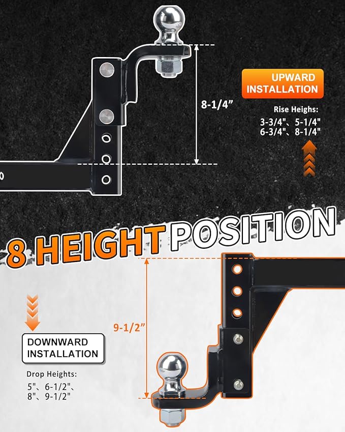 - ADJUSTABLE TRAILER HITCH: Our adjustable trailer hitch features 6 pin holes and can be turned upside down, offering a 9-1/2" drop depth and 8-1/4" rise height for flexible adjustment to get optimal position with no need to ever change hitches for different vehicles.