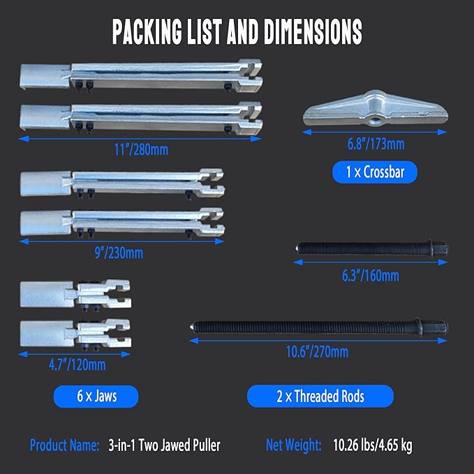 - 【Size Specification】 9-Piece gear puller set contains 3 sizes of puller jaw, beam length: 6.8 in/17.3 cm, long screw: 10.7 in/27 cm, short screw: 6.3 in/16 cm, long pulling jaw: 11 in/28 cm, standard pulling jaw: 9 in/23 cm, short pulling jaw: 4.8 in/12 cm, ensure you're always prepared for a variety demolition task.