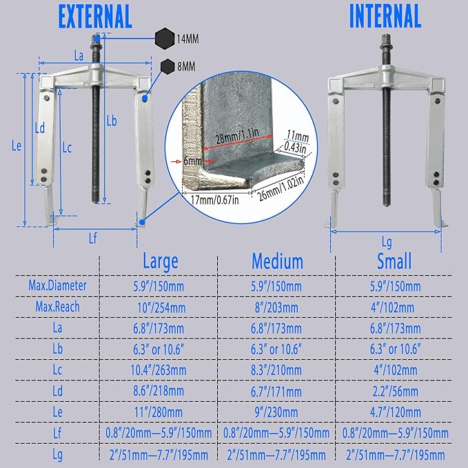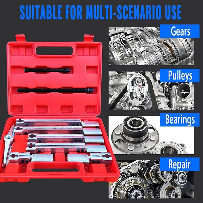 - 【Versatile Tool】: This 9-piece gear puller set is designed for removing pulleys, flywheels, bearings and gears with inner or outer jaws. The 2 Jaw Gear Puller consists of two screws of different sizes and 3 sets of pulling jaws to meet the multi-scenario use, comes with a special plastic case, easy to carry, perfect for automotive repair workers, mechanical repairers, mechanical and electrical equipment repairers.