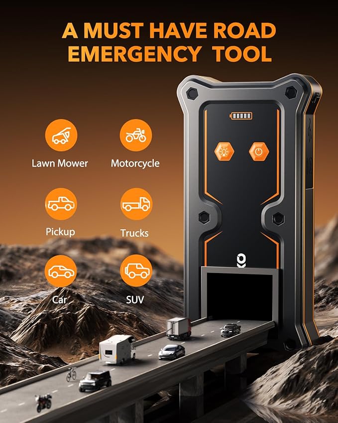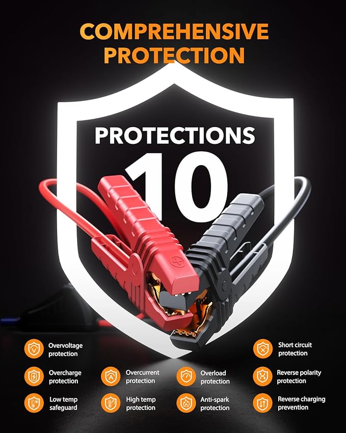 - 【Advanced Safety Technology】The jump box provides 10 comprehensive safeties, including reverse polarity, overcurrent, reverse connection, overvoltage, overcharge, overdischarge, overload, short circuit, low/high-temperature protection, and spark-resistance. The more rugged shell protects the jump starter from harsh outdoor environments such as water, dust, and bumps, and it can work in extremely cold and hot conditions. Perfect for northern areas with harsh winters, don't hesitate to choose it